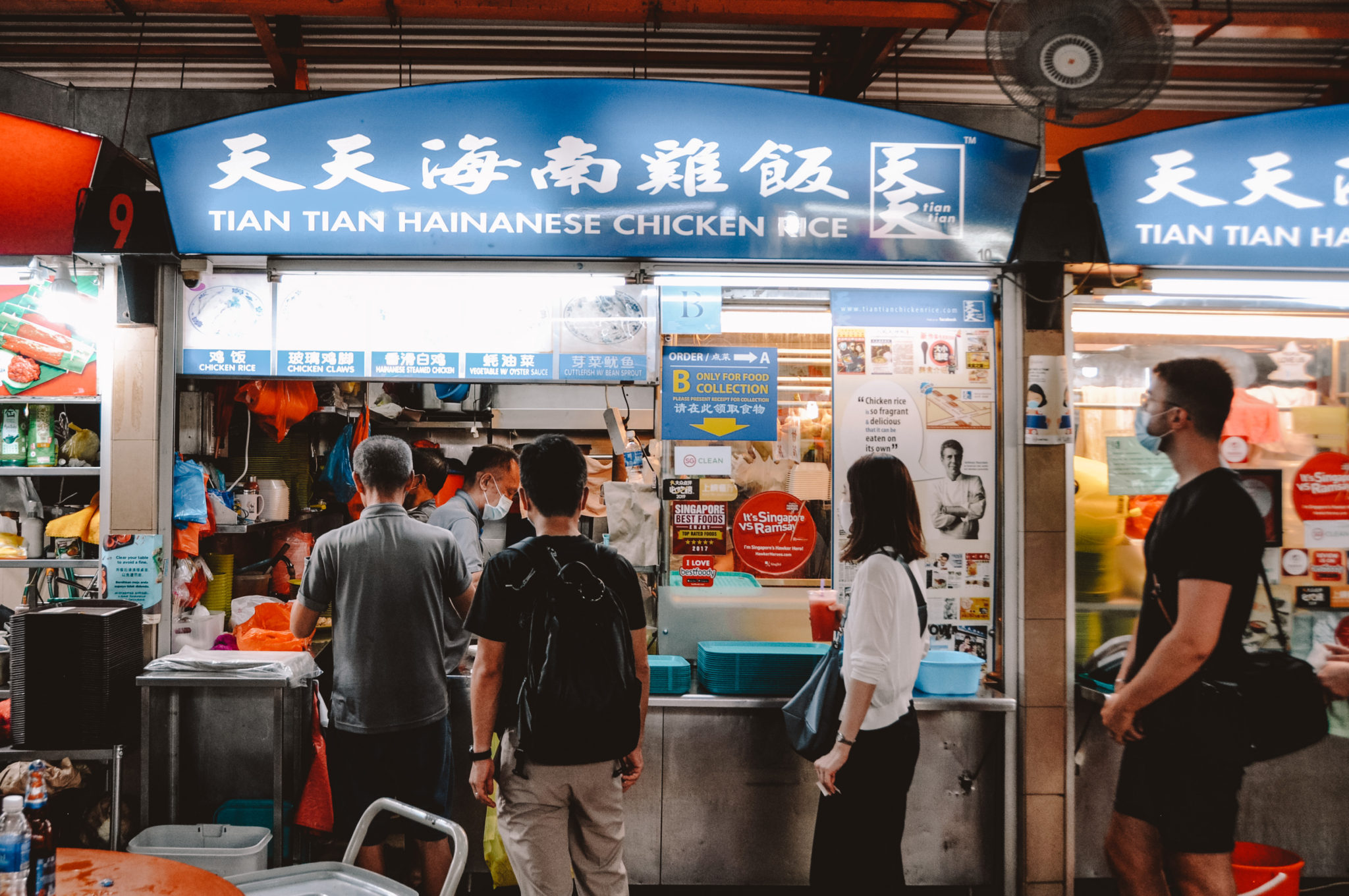 - The most famous one is Tian Tian Hainanese Chicken Rice (#01-10/11). Being highly praised by travel foodie Anthony Bourdain and receiving a Michelin bib gourmand, this hawker stall is very hyped and often has long queues. The chicken is soft and the rice is fragrant. However, the chili sauce is lacking and is generally soft in taste.