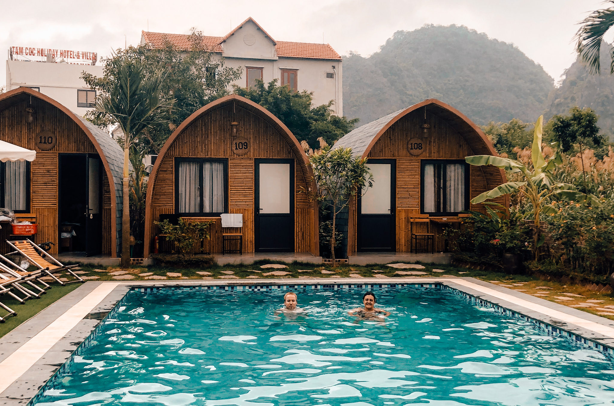 For a nicer stay, I can only recommend Tam Coc Village Bungalow, a beautiful hotel with individual bamboo bungalows, a nice swimming pool and stunning views to the rice fields and mountains. this is where we chose to stay and we loved it! Also, the family that runs it is absolutely delightful and helpful, they serve a homemade breakfast and bikes are included in the price! Plus, it’s locally owned. Rooms start at around 30€ per night. Another option is the famous Mua Caves Ecolodge, also in the same price range, although it is a bit far from the town.