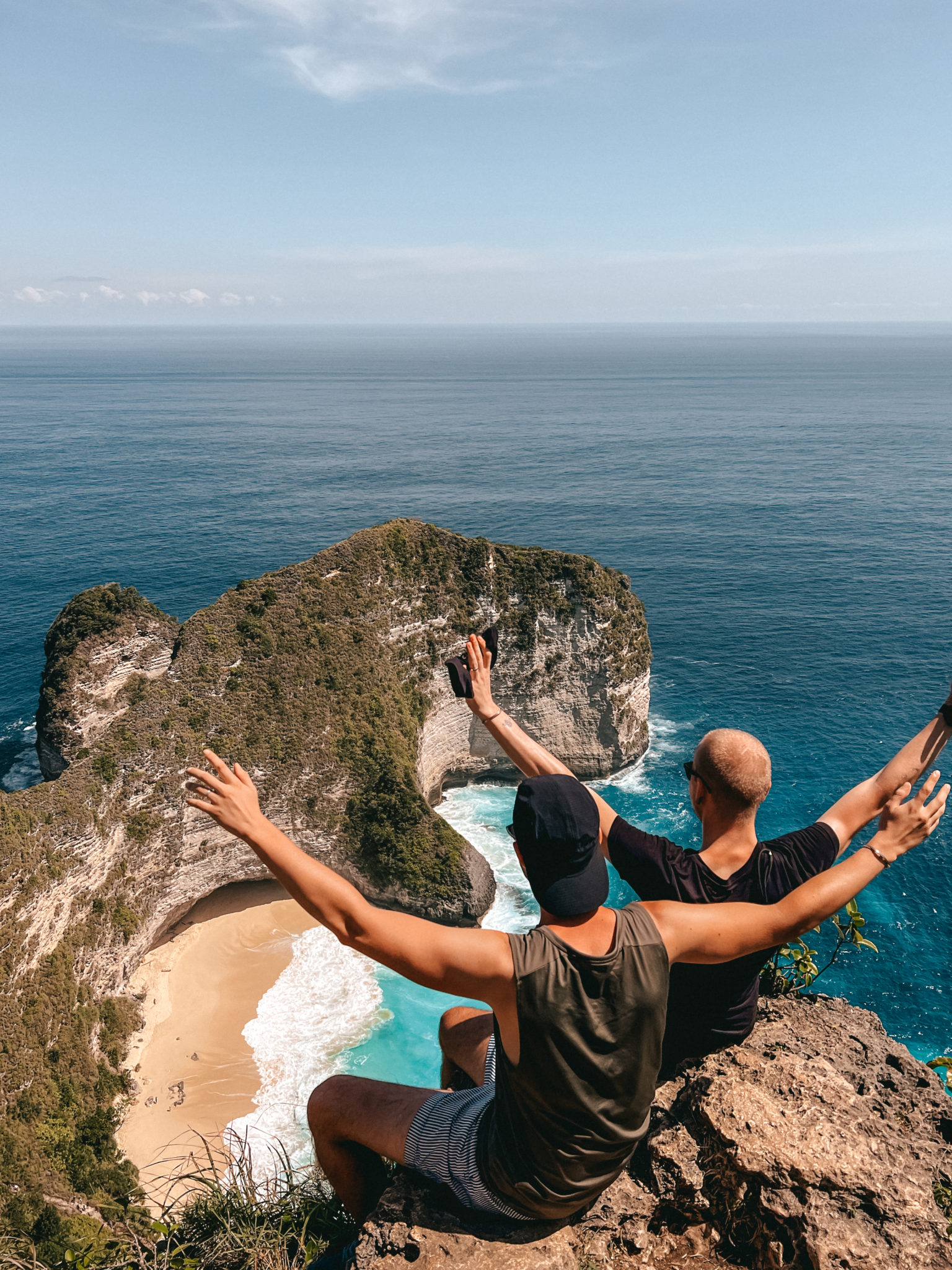 To get to Kelingking Beach, you can park their scooter or car at the top of the hill (for a 5k IDR fee) and enter the area. Start by taking some pictures of this beautiful cliff from above. You’ll see that there is a platform where everyone is queuing to take the same picture. If you go to the right and follow the trees, you’ll reach another perfect spot for pictures where there is no one (except a few mischievous monkeys). Here’s the proof: