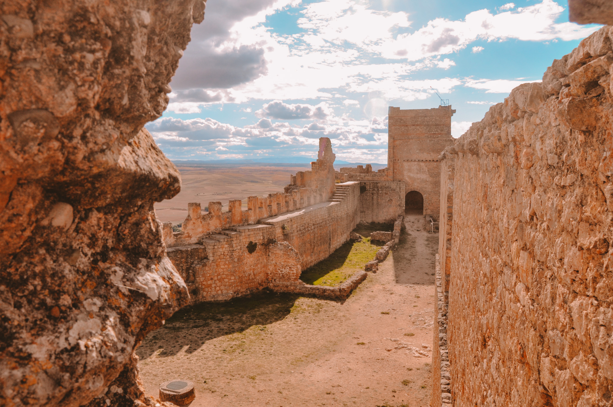 On the outskirts of the town of Gormaz, the castle of Gormaz rises on top of a hill, overlooking the Castilian fields, with forgotten grandieur. It was built in the X century to protect the borders of the Caliphate of Córdoba from the Christian Kingdoms to the north. At the time of its construction, it was the largest fortress ever built in Europe and, to this day, it still remains the largest caliph structure in European land. While many structures were refurbished by the Christians after the reconquests, some Arabic elements still remain, such as the horseshoe arch gate, a great homage tower of mudéjar style used to collect rainwater or the Tower of Almanzor, who retook and ruled the fortress until its definitive reconquest in 1060 A.D.