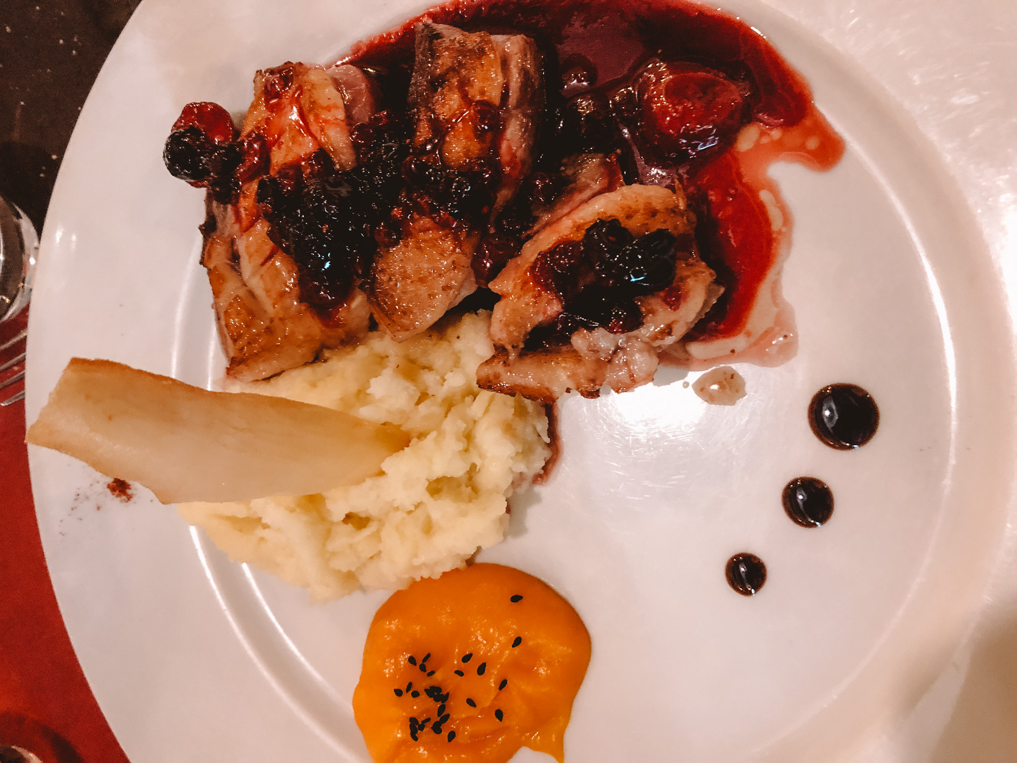 - Restaurante Puerta de Terrer: this place focuses on cocina de mercado, which is a Spanish term for local cuisine based on local produce from the market. This means that their menu changes every day depending on the availability and seasonality of products at the market. They have in my opinion the best business menu in town, with a very good price (13€ for 3 courses, bread, water and wine) and excellent food. Recommended: lunch menu (there are always nice options), milhojas (savoury layered cake of puffed pastry stuffed with variable things depending on the day), duck confit with red berries.